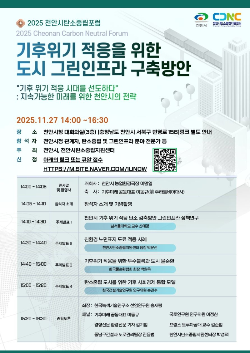 포럼은 ‘탄소중립을 선도하는 지속가능한 친환경 녹색도시, 천안’ 비전 실현을 목표로 정책 실행력을 높이기 위해 마련됐으며, 기조강연에서는 ‘기후위기 적응을 위한 도시 그린인프라 구축방안’을 주제로, 천안시 여건에 맞는 탄소 감축 전략과 그린인프라 정책이 제시할 예정입니다.
