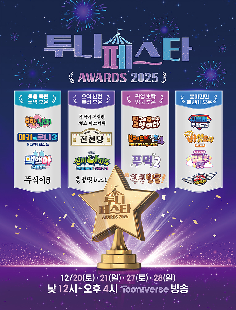 [서울경제TV=김민영 인턴기자] CJ ENM 투니버스는 연말을 맞아 한 해 동안 큰 사랑을 받은 콘텐츠들을 모아 ‘투니페스타 어워즈 2025’를 개최한다고 1일 밝혔다.