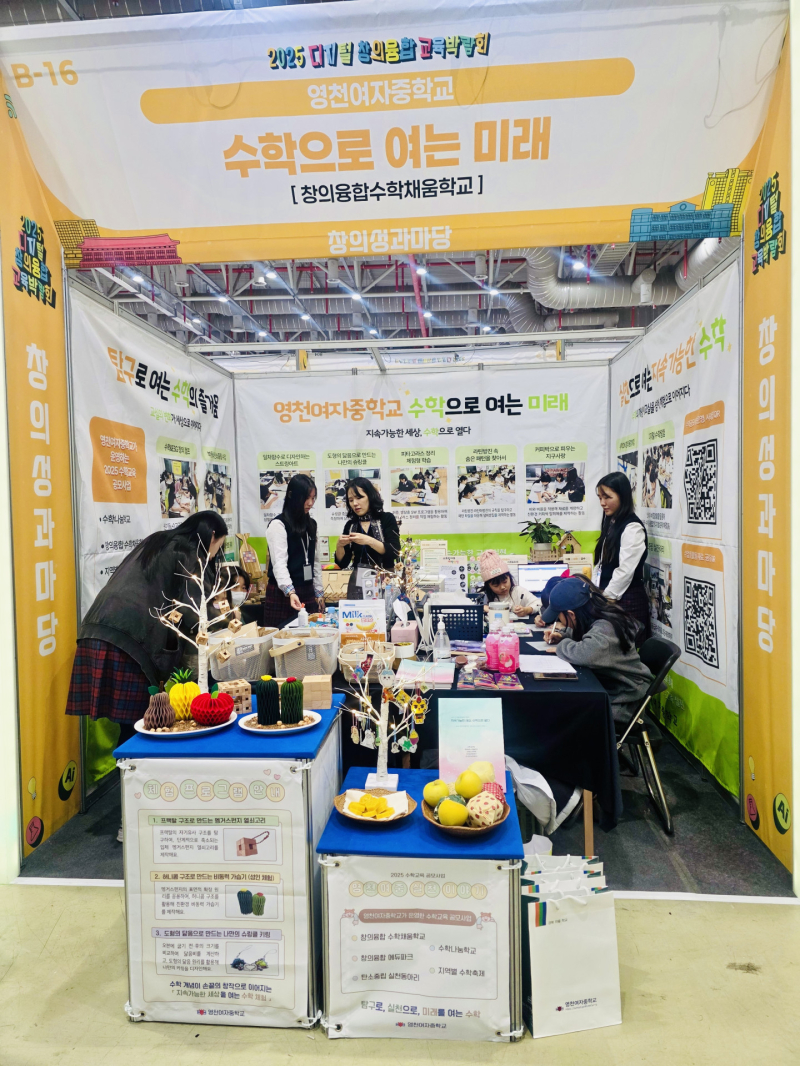 [서울경제TV 영천=김아연 기자] 영천여자중학교는 11월 28일과 29일 양일간 구미코(GumiCo)에서 열린 『2025 디지털 창의융합 교육박람회』에 참여하여, 창의융합수학채움학교 우수학교로 선정된 성과를 바탕으로 ‘수학으로 여는 미래’학교 부스를 운영하였다.