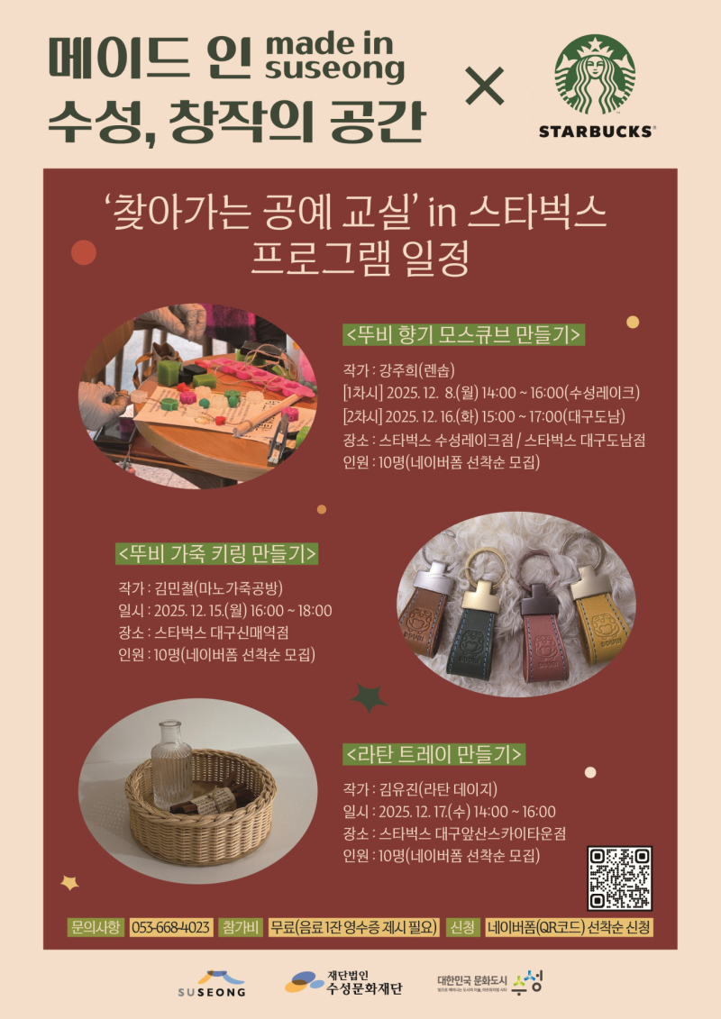 이번 ‘찾아가는 공예 교실’은 수성구의 조향·라탄·가죽공방 작가들이 직접 참여하며, 대구 지역의 스타벅스 매장 네 곳에서 진행된다.