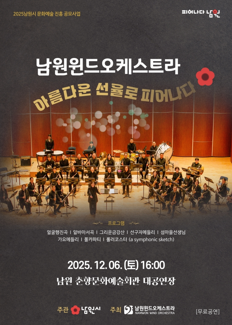 이번 정기연주회는 남원시 문화진흥공모사업에 선정된 공연으로, 2017년 창단된 남원윈드오케스트라가 8년간 꾸준히 이어온 지역 문화활동의 결실이다. 이들은 남원예술제, 남원시립 김병종미술관 음악회 등 다양한 무대에서 지역과 소통하며 음악 저변 확대에 힘써왔다.