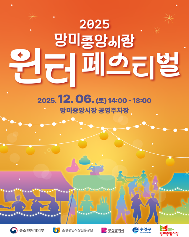 [서울경제TV=이채우 인턴기자] 부산 수영구 망미동에 위치한 대표 전통시장 망미중앙시장은 오는 6일 오후 2시부터 6시까지 시장 공영주차장에서 2025 망미중앙시장 윈터 페스티벌(Winter Festival)을 개최한다고 4일 밝혔다.
