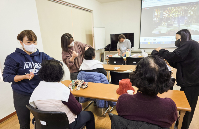 봉사단은 섬세한 손길로 어르신들의 지친 피부와 두피를 정성껏 보살폈으며, 특히 따뜻한 손 마사지로 어르신들의 혈액 순환을 돕고 정서적 교감을 나눴다.
