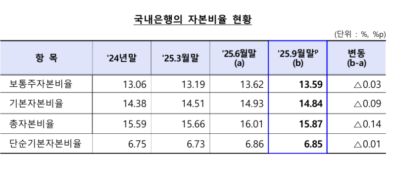 - 93분기 국내은행 BIS 보통주자본비율 13.59%…전 분기比 0.03%p 하락