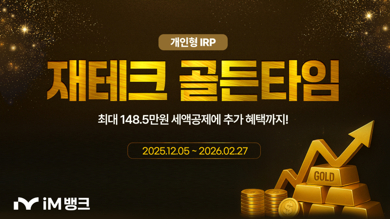 ‘개인형 IRP 재테크 골든타임’ 이벤트는 iM뱅크(아이엠뱅크) 개인형 IRP 계좌 신규가입고객과 기존 고객이 모두 참여 가능하며, 연말 정산 시즌인 12월5일부터 2026년 2월27일까지 실시된다.