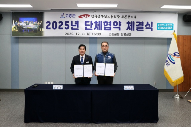 9일 고흥군에 따르면 전날 군청 팔영산홀에서 진행된 이번 체결식은 2023년 6월부터 시작된 2년 5개월간의 교섭 대장정을 마무리하는 자리였다. 공 군수는 교섭 기간 내내 노조와의 관계를 ‘상호 신뢰와 존중’의 틀에서 접근하도록 지휘했으며 공직자들의 근무 여건 개선과 복지 증진을 최우선 과제로 추진했다.