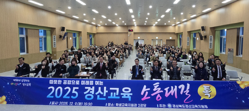 [서울경제TV 경산=김정희 기자] 경상북도경산교육지원청(교육장 정수권)은 12월 9일 경산교육지원청 학생교육지원관 2강당에서 경산시장 및 도의회 의원, 관내 유․초․중․고등학교 교(원)장, 학교운영위원장, 학부모회장, 녹색어머니회, 학생상담자원봉사자, 주민감사관 및 공약이행단 대표, 교육계 원로 등 경산 교육가족 220여 명을 초청해 ‘교육감과 함께하는 2025 경산교육 소통대길 톡’을 개최했다.