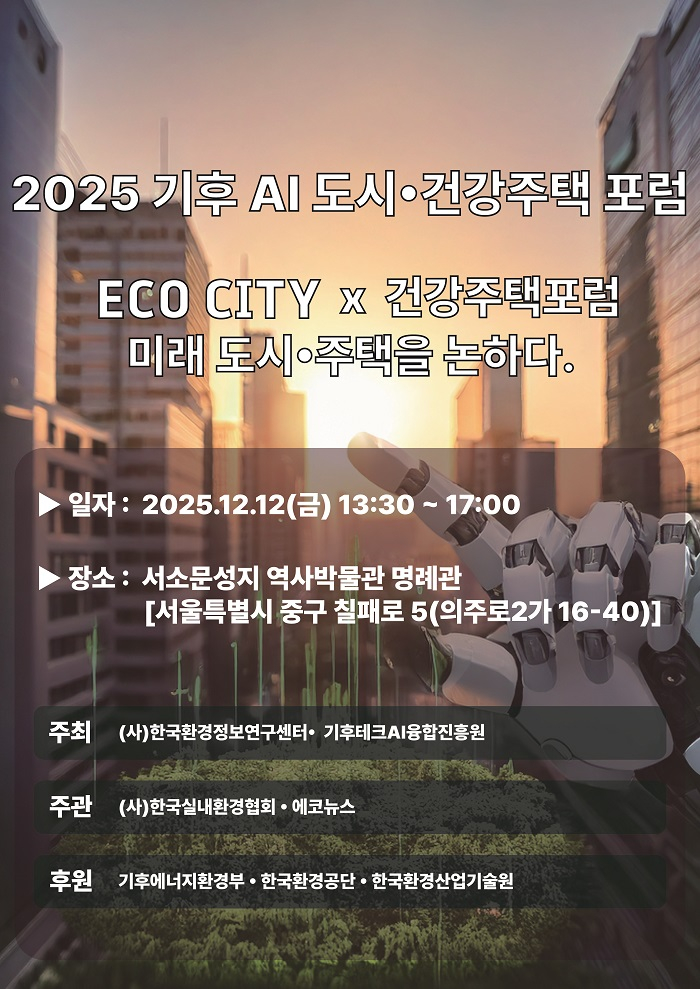 이번 포럼은 기후변화로 인한 도시 문제와 주거환경의 변화를 주목하고 AI 기반 기술을 활용한 에너지 절감, 실내환경 개선, 안전 대응 등 지속가능한 미래 도시 모델을 논의하기 위해 마련됐다. 행사는 한국환경정보연구센터와 기후테크AI융합진흥원이 주최하고 한국실내환경협회와 에코뉴스 공동주관으로 진행되며 기후에너지환경부와 한국환경공단, 한국환경산업기술원이 후원한다.