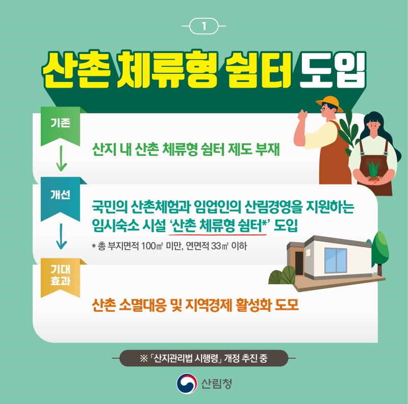 이번 제도 개선은 그동안 산지 내 임시숙소 설치 기준이 불명확해 활용에 제약이 있었던 문제를 해소하기 위한 것으로, 총 부지면적 100㎡ 미만, 연면적 33㎡ 이하 규모의 소규모 시설을 '산촌 체류형 쉼터'로 인정하는 방안이 검토되고 있다. 산촌 방문객의 체류 공간 확충은 물론, 임업인의 작업·경영 활동에도 실질적 도움을 줄 것으로 기대된다.