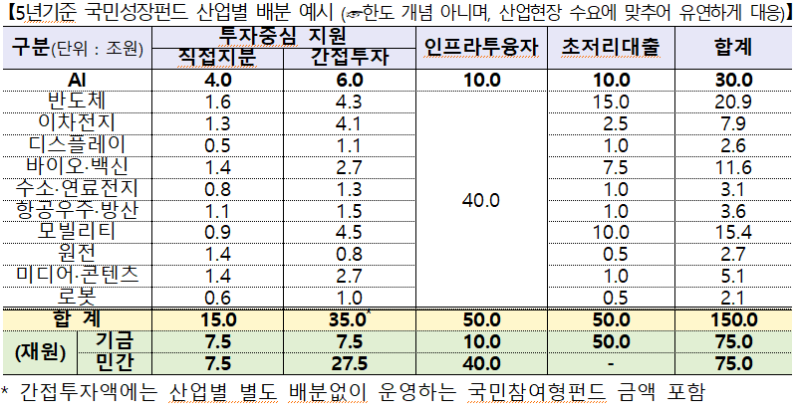 국민성장펀드는 5년간 정부보증채권 75조원과 민간자금 75조원을 합쳐 총 150조원 규모로 조성된다. AI·반도체·바이오·로봇 등 첨단전략산업과 관련 생태계를 폭넓게 지원한다. 전체 자금의 40% 이상은 지역에 배분한다는 방침이다.