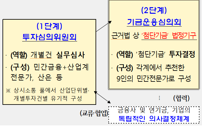 기금운용심의위원회는 첨단기금이 투입되는 사업에 대한 최종 투자 결정을 맡는다. 국민성장펀드의 개별투자건 중 첨단전략산업기금(이하 ‘첨단기금’)이 활용되는 부분에 대해 최종 의사결정을 담당한다. 기금운용심의회 위원은 법령이 정한 기관들로부터 추천을 받아 위촉을 하고, 위촉작업이 마무리되면 기금운용심의회를 개최해 첨단기금의 주요 투자사항에 대해서 결정하게 된다. 금융당국은 "함께 참여하는 민간자금은 1단계 투심위 과정에서 이미 충분한 의사소통이 된 상태인만큼 국민성장펀드 틀 안에서 첨단기금 투자부분과 협업하되, 개별 의사결정과정을 독립적으로 이행한다"고 설명했다.
