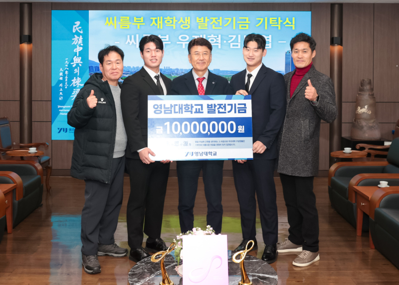 최외출 영남대 총장은 “학업과 훈련을 병행하며 전국 무대에서 뛰어난 성과를 거둔 것도 자랑스러운 일이지만, 재학 중 모교와 후배들을 위해 나눔을 실천한 두 학생의 마음이 더욱 값지게 느껴진다. 또한 학생들을 훌륭한 선수이자 올바른 인성을 갖춘 인재로 키워주신 부모님께도 깊이 감사드린다”며 “씨름은 한국인의 얼과 정신이 담긴 전통 스포츠로, 오늘 기탁한 발전기금은 씨름의 전통을 계승해 나갈 후배들이 더 나은 환경에서 꿈을 키울 수 있도록 소중히 활용하겠다”고 말했다.