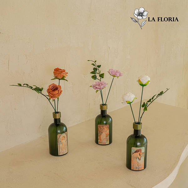라플로리아는 알폰스 무하의 예술적 감성을 모티브로 한 디자인을 시그니처로 내세운 디퓨저 브랜드다. 꽃장식과 리드스틱을 결합해 사용하는 형태를 선보였다.