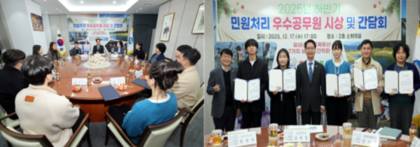 2025년 하반기 민원·국민신문고 응대 우수공무원 시상식과 간담회는 지난 17일 열렸으며 민원처리 우수공무원은 각 분야별로 5명씩을 선정해 표창을 수여했다.국민신문고 분야는 민원처리 건수, 담당자의 민원요지 파악, 성실한 답변 등을 평가했다. 서민지 주무관(도시디자인과), 김민경 주무관(환경위생과), 고민성 주무관(사회복지과), 박재규 주무관(종합민원과), 유혜령 주무관(문화예술과)이 선발됐다.