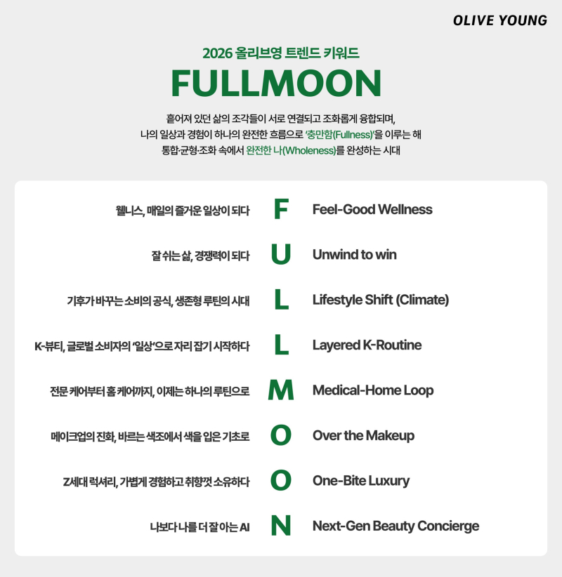 [서울경제TV=김민영 인턴기자] CJ올리브영은 올해와 내년 K뷰티와 웰니스(Wellness) 산업을 관통하는 핵심 키워드로 'F.U.L.L.M.O.O.N(보름달)'을 선정하고, 8가지 세부 트렌드를 소개하는 '2026 트렌드 키워드' 리포트를 발간했다고 19일 밝혔다.