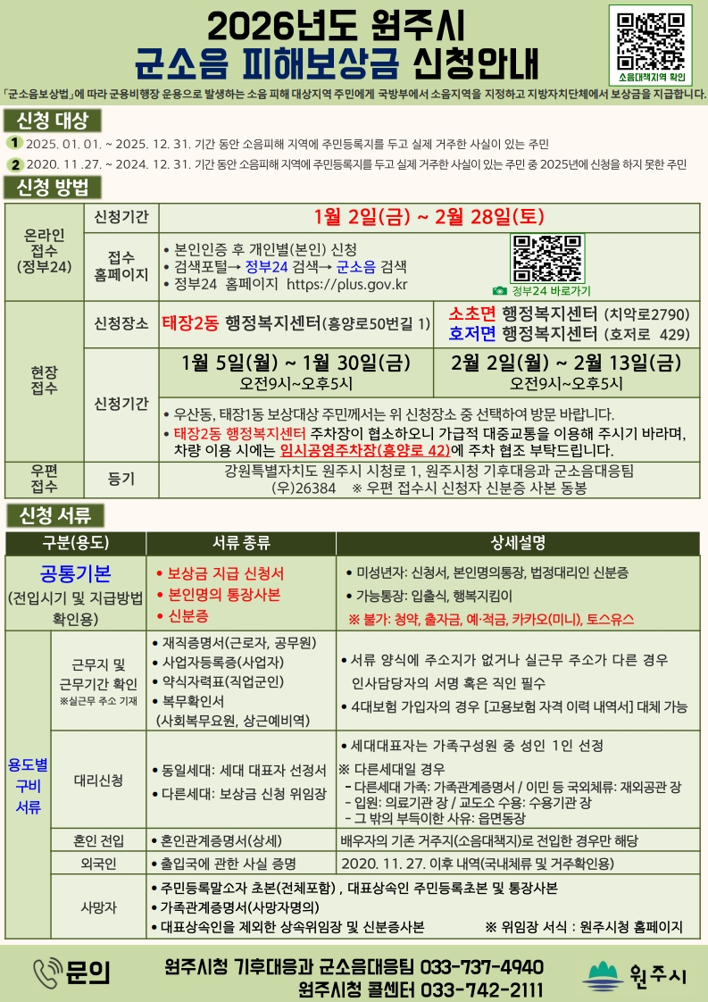 온라인 접수는 정부24 홈페이지에서 진행된다. 신청 서식 등 자세한 사항은 시 홈페이지에서 확인할 수 있다. 보상금은 원주시 소음대책심의위원회 심의를 거쳐 5월 말까지 지급 결정을 통지하고, 8월 말 개별 지급될 예정이다.