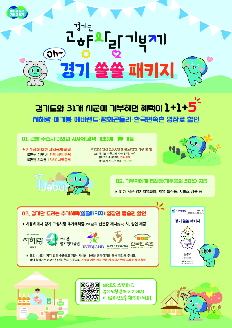경기도 및 31개 시군에 10만 원 이상 기부한 경우 기부일로부터 1년간 에버랜드와 한국민속촌을 비롯해 제부도 해상케이블카, 임진각 평화곤돌라, 김포 애기봉 평화생태공원 등 5곳에서 입장권 또는 이용 요금 할인을 받을 수 있다.