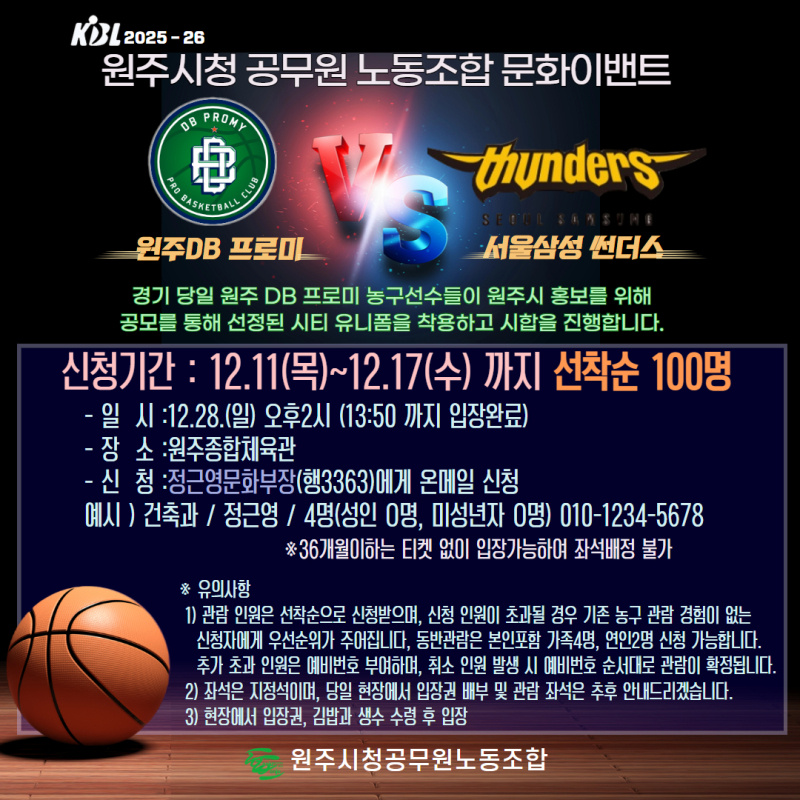 - 12월 28일(일) 원주DB프로미 농구단의 시티 유니폼 착용일에 맞춰 단체 응원 계획