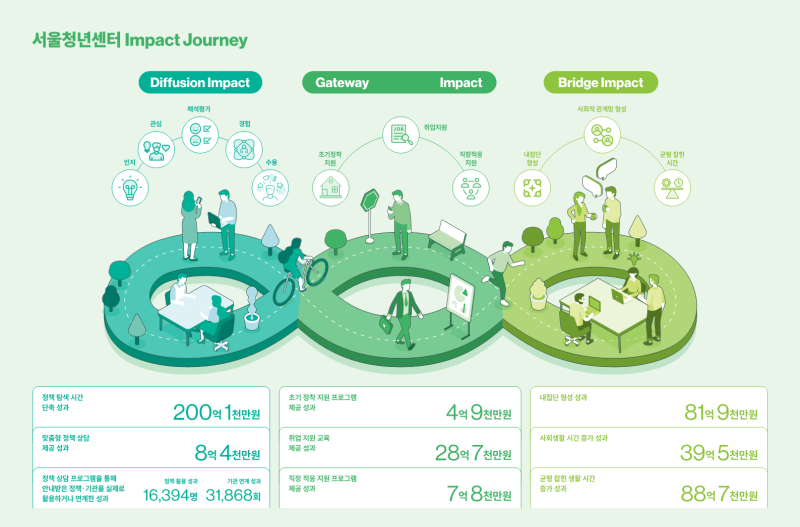 청년정책의 도달과 참여를 견인하는 인프라로서의 디퓨전 임팩트는 230억 원, 다양한 정책자원을 연결하는 정책 내비게이터 역할인 게이트웨이 임팩트는 590억 원, 청년의 사회적 복원력을 높이는 공동체적 기반 형성 성과인 브릿지 임팩트는 260억 원의 화폐 가치로 집계됐다.