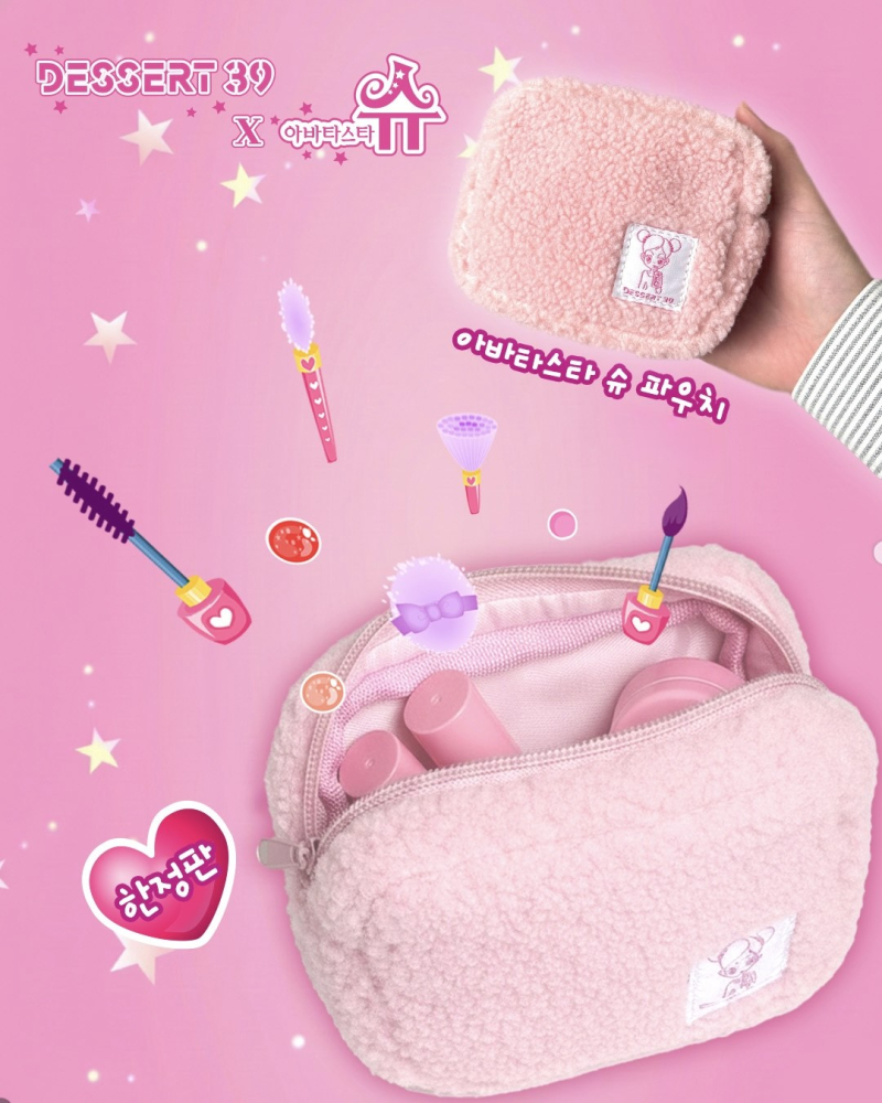 이 같은 성원에 힘입어 디저트39는 겨울 시즌에 어울리는 2차 콜라보 굿즈 ‘아바타스타 슈 파우치’를 새롭게 출시한다. 이번 파우치는 포근한 소재와 핑크 컬러를 적용한 귀엽고 사랑스러운 디자인이 특징으로, 전면에는 ‘아바타스타 슈’ 로고를 포인트로 더해 소장 가치를 높였다.