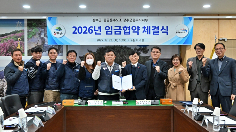 [서울경제TV 장수=최영 기자] 전북 장수군은 26일 군청 2층 회의실에서 전국공공운수노조 전국자치단체공무직본부 장수군지부와 2025년 임금협약을 체결하고, 2025·2026년 임금협약을 최종 확정했다고 밝혔다.
