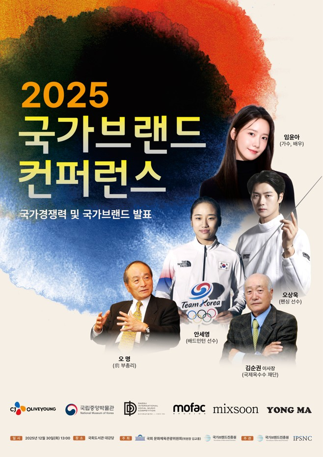 이번 컨퍼런스에서는 ‘2025 국가브랜드대상’ 시상식이 함께 진행된다. 수상자는 ▲문화 부문 배우 임윤아 ▲예술 부문 대구국제성악콩쿠르, 국립중앙박물관 ▲스포츠 부문 오상욱 선수, 안세영 선수 ▲기업 부문 CJ 올리브영, 모팩스튜디오 ▲한상기업 부문 ㈜용마일렉트로닉스 등이다.