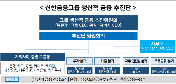 지난 달에는 해당 조직을 그룹 CEO를 위원장으로 하는 그룹 생산적 금융 추진위원회로 격상해 그룹 차원의 기본 구상을 마련했다. 이어 해당 전략을 현장에서 속도감 있게 실행하고 효과성을 높이기 위해 생산적 금융 통합 추진·관리 조직인 그룹 생산적 금융 추진단을 이번에 새롭게 발족시켰다.