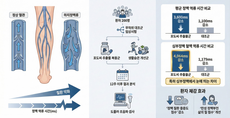 그 결과, 포도씨 추출물 복용군의 평균 정맥 역류 시간은 약 3600ms 감소한 반면, 대조군은 약 1100ms 감소에 그치며 통계적으로 유의한 차이를 보였다.