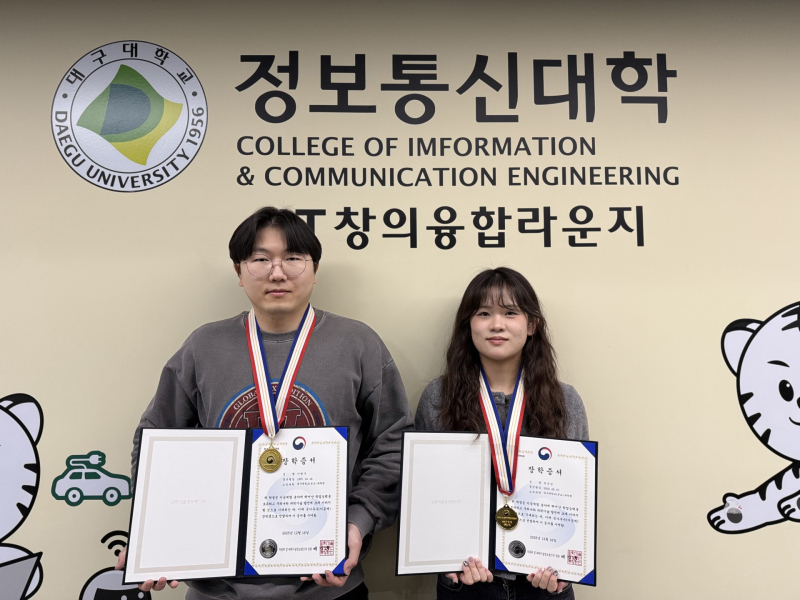 [서울경제TV 대구=김정희 기자] 대구대학교(총장 박순진) 대학원 컴퓨터정보공학과 석사과정에 재학 중인 박은영·이현우 학생이 과학기술정보통신부와 한국장학재단이 발표한 ‘2025 석사우수장학금(이공계)’ 장학생으로 선발됐다.