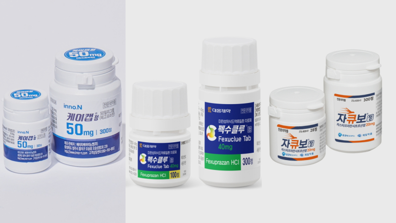 이 같은 단점을 극복하기 위해 등장한 신약이 P-CAB 계열 치료제입니다. P-CAB 제제는 식사와 상관없이 복용이 가능하고 효과 발현도 빠릅니다. 대표적인 P-CAB 제제로는 2018년 국산 신약 30호로 승인된 HK이노엔의 ‘케이캡’, 2021년 국산 신약 34호 대웅제약의 ‘펙수클루’, 지난해 국산 신약 37호로 승인된 온코닉테라퓨틱스의 ‘자큐보정’이 있습니다.
