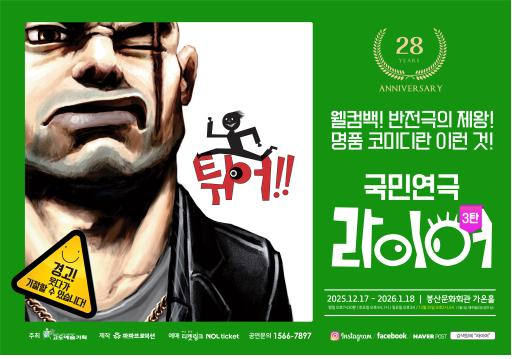 [서울경제TV 대구=김정희 기자] 올해로 창작28주년을 맞이한 국민연극 <라이어3탄-튀어>가 12월 17일부터 2026년 1월 18일까지 봉산문화회관에서 펼쳐진다.