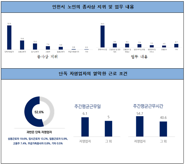 보고서에 따르면 인천시 60세 이상 노인의 60.1%가 경제활동에 참여하고 있으며 절반 이상은 근무일수와 근무시간이 긴 단독 자영업자로 상대적으로 열악한 노동환경에 놓여 있었다.