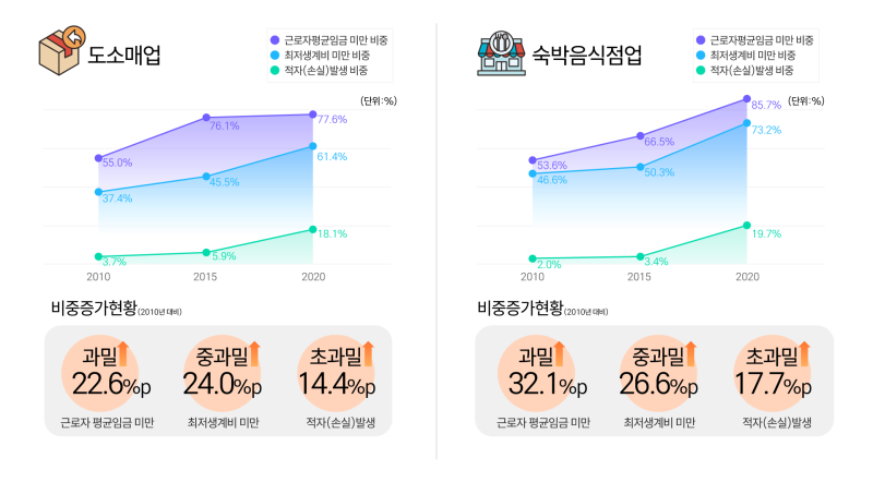 인천신용보증재단 조사 결과 2020년 기준 도소매업 사업체의 77.6%가 근로자 평균임금에 미치지 못했다.