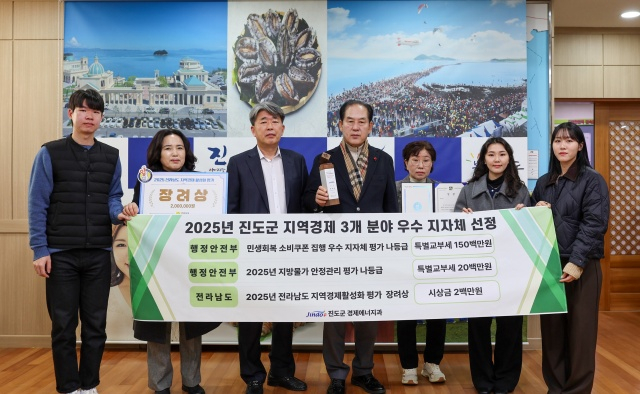 31일 진도군에 따르면 최근 ‘민생회복 소비쿠폰 집행’과 ‘지방물가 안정관리’ 분야에서 행정안전부 우수 지자체로 선정돼 각각 1억5000만 원과 2000만 원의 특별교부세를 받게 됐다. 또한 전남도 주관 ‘2025 지역 경제 활성화 평가’에서도 장려상을 수상하며 시상금 200만 원을 추가로 확보했다.